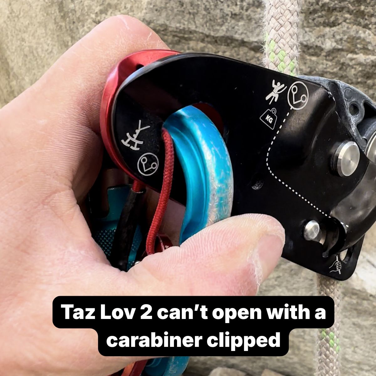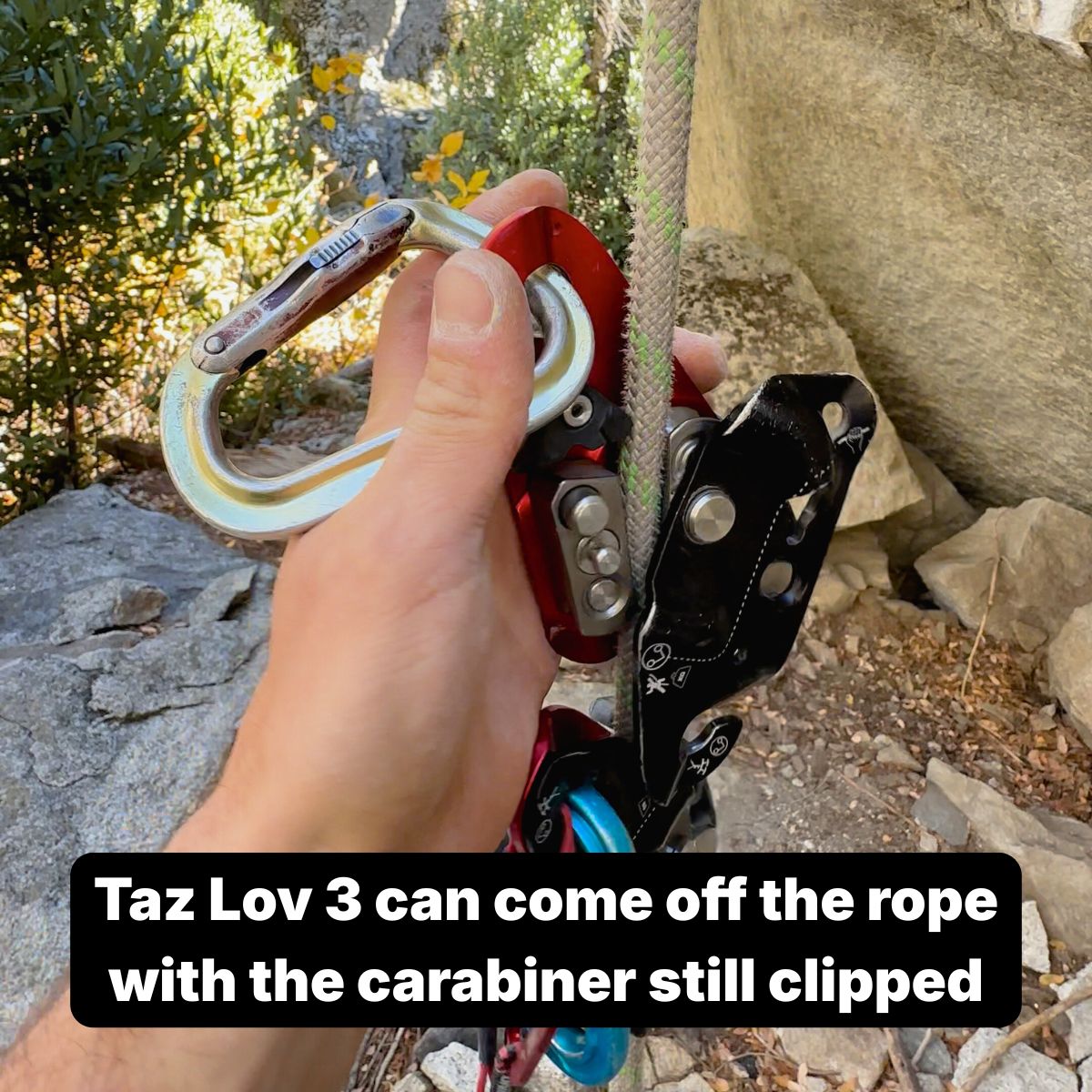 The Taz Lov3 can come off the rope while the carabiner stays clipped.